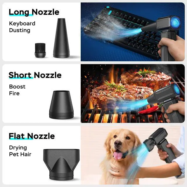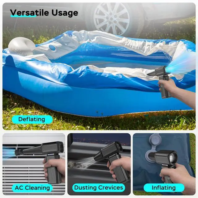 Versatile UsesThis electric duster comes with a long nozzle,a short nozzle,a flat nozzle,and a brush head that fits onto the long nozzle,making it perfect for cleaning keyboards,air conditioners, circuit boards, and toys.The jet blower can also blow water off car mirrors,remove dust from interiors,clear debris from floor mats,and inflate air mattresses.Attach the nozzles to the intake port to transform it into a suction device for faster deflation.