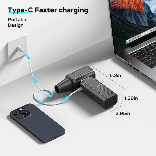 Cost-effective and PortableUnlike compressed air cans,this jet fan eliminates the need for disposable products during cleaning,protecting your electronic devices and saving you money over time.It's a one-time investment that meets all your daily cleaning needs.Its portable,cordless design and compact size make it easy to carry anywhere,even fitting into your pocket, simplifying your dusting tasks.