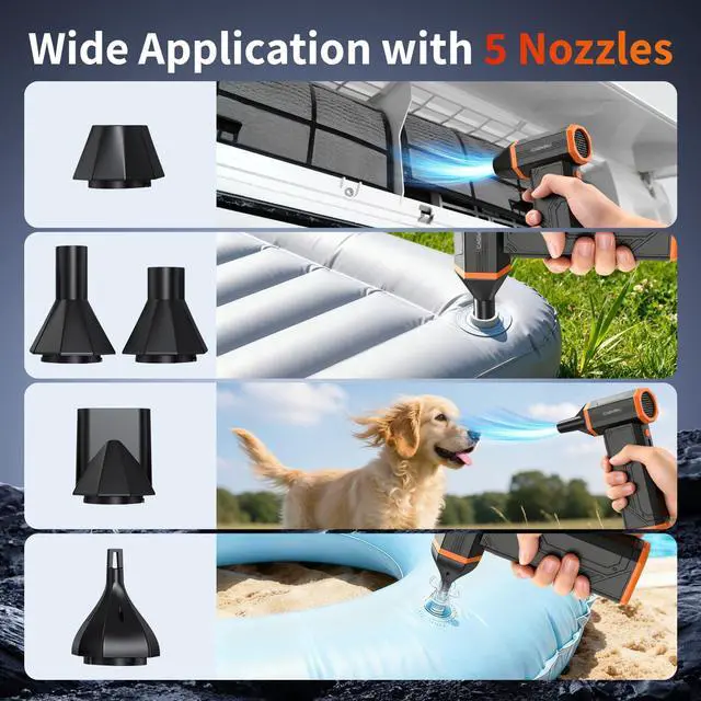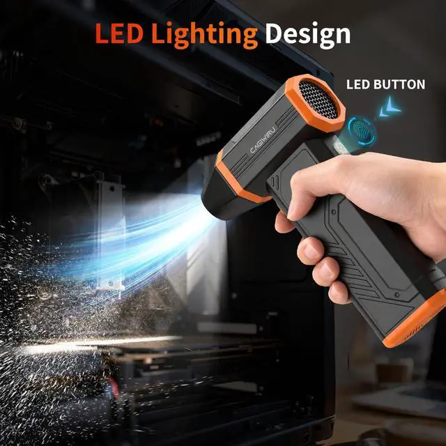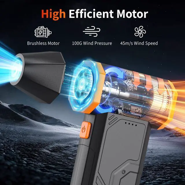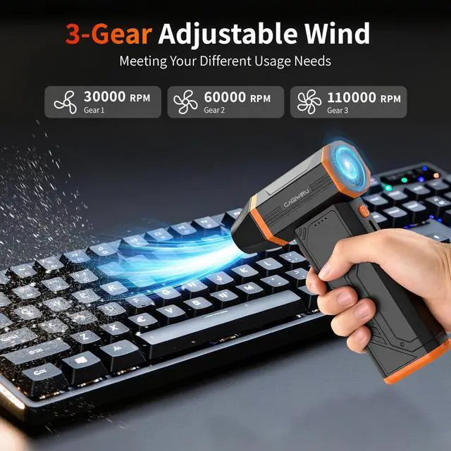 Upgraded Brushless Motor & Up to 110000RPMOur electric air duster is equipped with an innovative brushless motor that delivers more powerful airflow than usual at speeds of up to 110000RPM. 110g of air pressure and a maximum performance of over 130m/s dramatically improve cleaning efficiency!It also reduces power consumption and provides a comfortable cleaning experience.