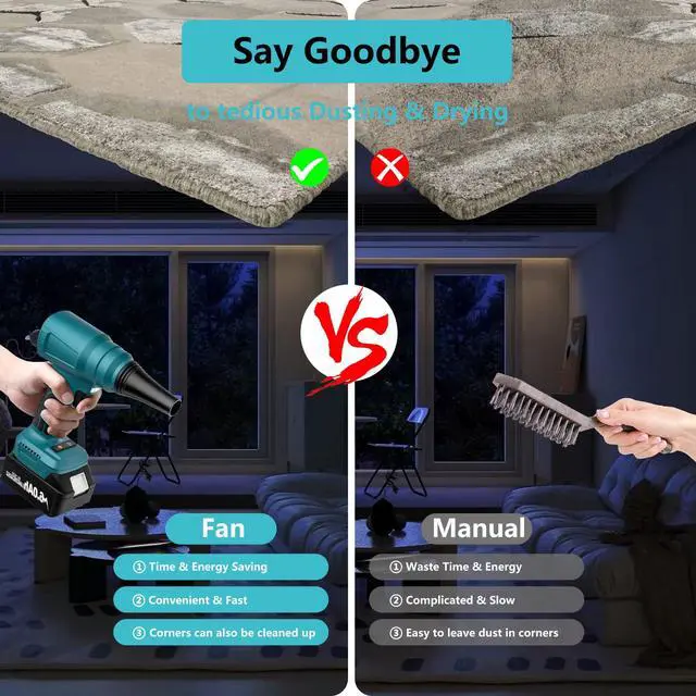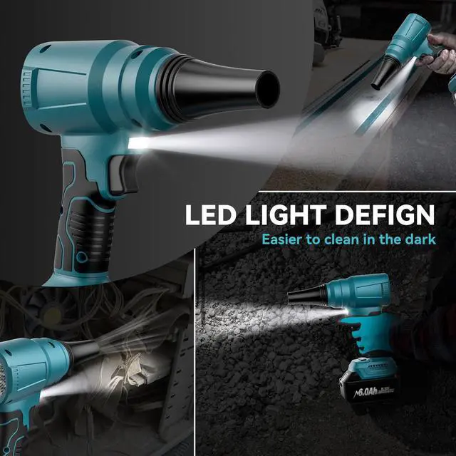 High-speed motor, compressed air alternativeOur Mini Blower features a customized low-voltage brushless motor with 4-pole sintered magnets, delivering high efficiency, low heat, powerful airflow, and low power consumption. Unlike compressed air tanks and rechargeable blowers, our cordless design is ideal for outdoor use without power supply and can be reused. The built-in LED light aids in cleaning dark areas, ensuring convenience and environmental benefits.