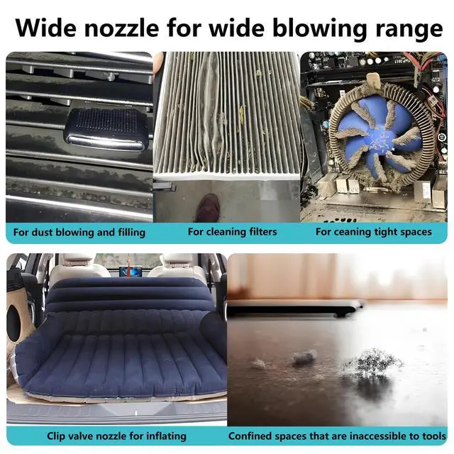 Versatile, Suitable For Various Occasions, Save MoneyThe compressed air dust collector is equipped with 3 nozzles and .It can clean dust and other impurities on electronic devices, computer keyboards, desks and vehicle interiors, making the target items look brand new. It can be used in various other scenarios, and can easily handle fallen leaf debris when it is used as a leaf blower.