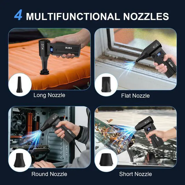 Versatile Cleaning ToolThis compressed air duster comes with four nozzles for various scenarios, meeting your diverse cleaning needs. The long nozzle suits inflating yoga balls and swimming rings. The flat nozzle is designed for cleaning gaps like window tracks. The round nozzle and short nozzle have wide applicationsblowing fallen leaves, removing snow, cleaning dust from computer cases or keyboard surfaces, and even starting outdoor fires to make flames more intense