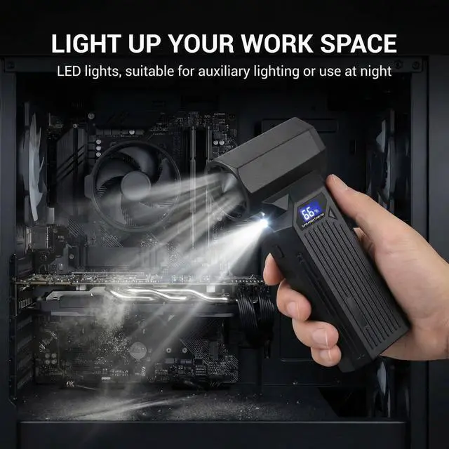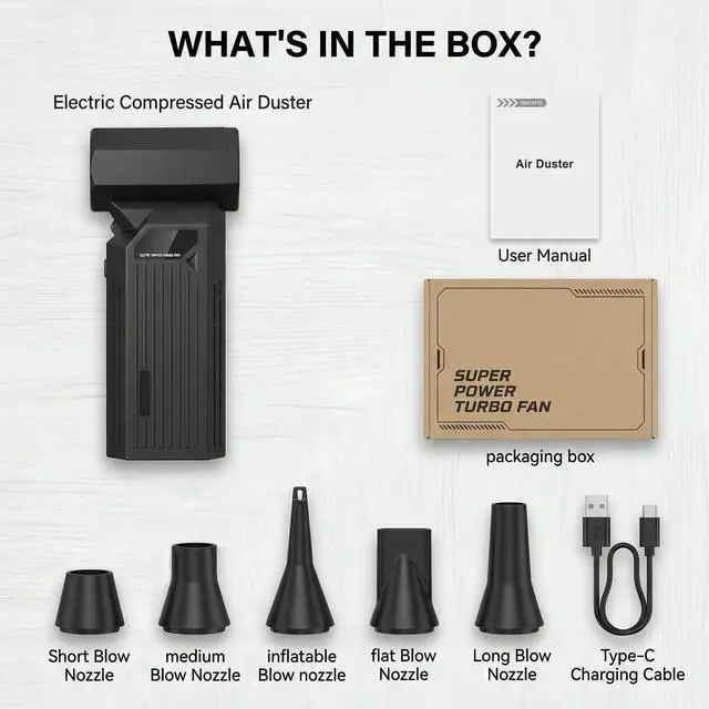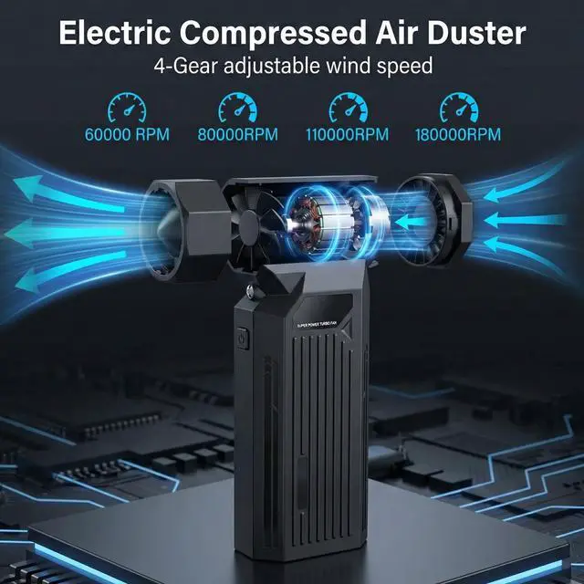 Compressed air DusterThis air duster devices remover adopts the newest powerful motor technology which with speed of 150000RPM, maximum blowing force of 150G without a nozzle;with a nozzle, the blowing force about 130G. The powerful wind force can clean up dust devices easily.