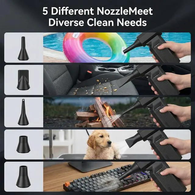 Multi-use The compressed air duster is equipped with 2different nozzles and 3 brushes, suitable for various occasions, to meet different cleaning demand. This compressed air duster it's can cleans crumbs, hair and dust from PC, keyboards, sofas, fax machines, printers, and air conditioners,It's the perfect choice for household, office, and car dust cleaning.
