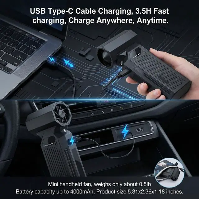 Rechargeable Air DusterUSB-Type C charging Port which supports up to 10W fast charging,Can be used for 180min,when fully charged.Energy saving, environmental protection, recyclable.Must use 5V/2A charger to charge the device; Otherwise, it may cause abnormal or non charging of the product.