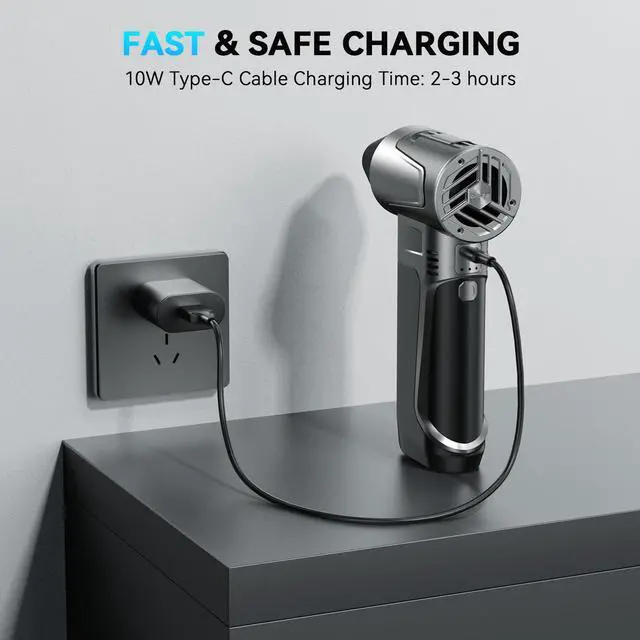 • 3-Speed & Fast Type-C ChargingFeatures three adjustable wind speeds for tailored cleaning power. Magnetic nozzles allow easy attachment changes. Includes a Type-C cable supporting 10W fast charging, with a full recharge in just 3 hours for user convenience.