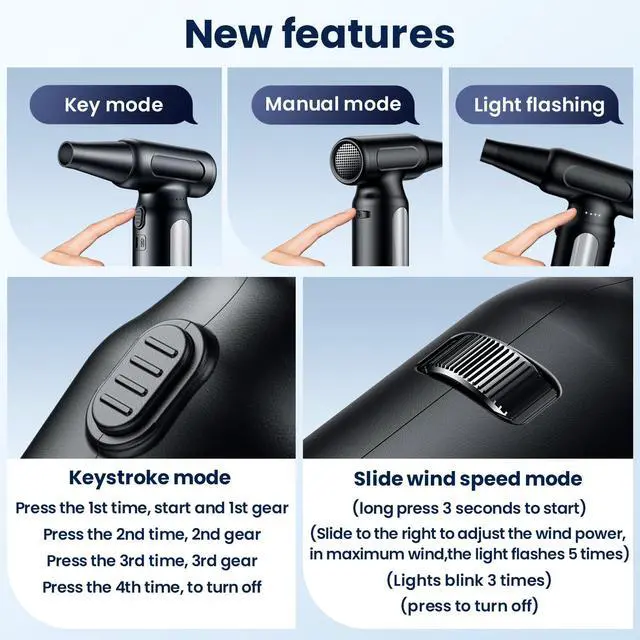 Compressed air dusterNew Pulley Mode Functional DesignThis air dusters is new upgraded version, we not only have 3- gear mode, but also add a new pulley mode, smooth sliding, more convenient and sensitive to use, you can choose the wind power you need. Aslo Fan adopting ergonomic design, the handle is more comfortable to touch.