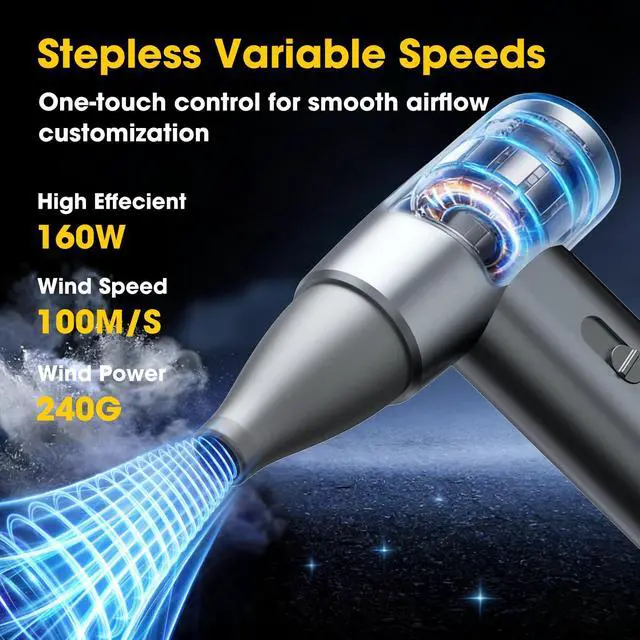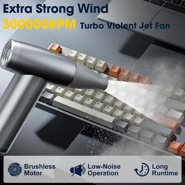 [300,000 RPM Super Speed & Stepless Speed Regulation]: This compressed air duster features a maximum rotation speed of up to 300,000 RPM and offers stepless speed adjustment. It can effortlessly clean tiny dust particles from door frames, toy models, fan blades, PCs, keyboards, and more. You can freely adjust the wind speed to meet your various cleaning needs.