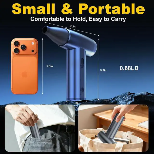 [Compact, Lightweight, Durable]: Measuring just 3.3*5.3*1.8 inches and weighing only 0.6 pounds, this electric air duster is designed for portability. Its sleek aluminum alloy body not only looks premium but also ensures durability. The ergonomic design provides a comfortable grip, so you can clean anytime, anywhere at home, in the office, or on the go.