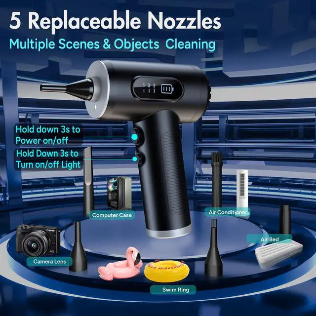 The LED light of electric duster illuminates dark corners and gaps for PC cases, windows crevices, etc.Making sure no speck of dirt goes unnoticed.