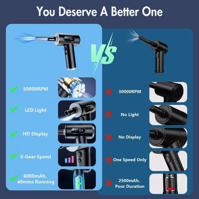 Powered by a robust 6000mAh battery, our compressed air dust blower boasts an extended runtime of 20-40 minutes, outlasting the competition.