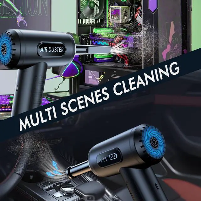 The electric air duster can be applied to objects such as keyboards, PC cases, electronics, circuit boards, camera lens, car interior, air conditioner that can't be immersed by water, and also hard-to-reach nooks, where an air can may not work.