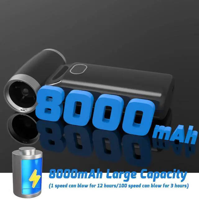 8000 mAh Large Capacity & Fast Charging Type-CThis dust blower features a built-in battery with a large capacity of 8000 mAh, allowing you to work continuously for up to 10 hours on the first gear when fully charged! Equipped with a fast-charging Type-C port, charging takes only half an hour, enabling you to clean for hours on end without interruption