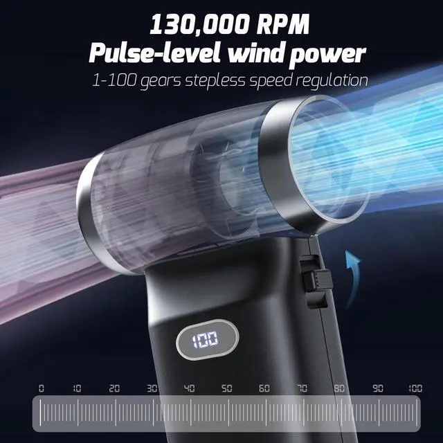 1~100 Speed Settings, Precise Speed AdjustmentThe compressed air duster offers 100 adjustable speed settings to meet various wind speed requirements. At the same time, the electronic display screen can check performance and speed settings in real-time, allowing you to select the appropriate wind speed according to your needs, making it environmentally friendly and energy-efficient