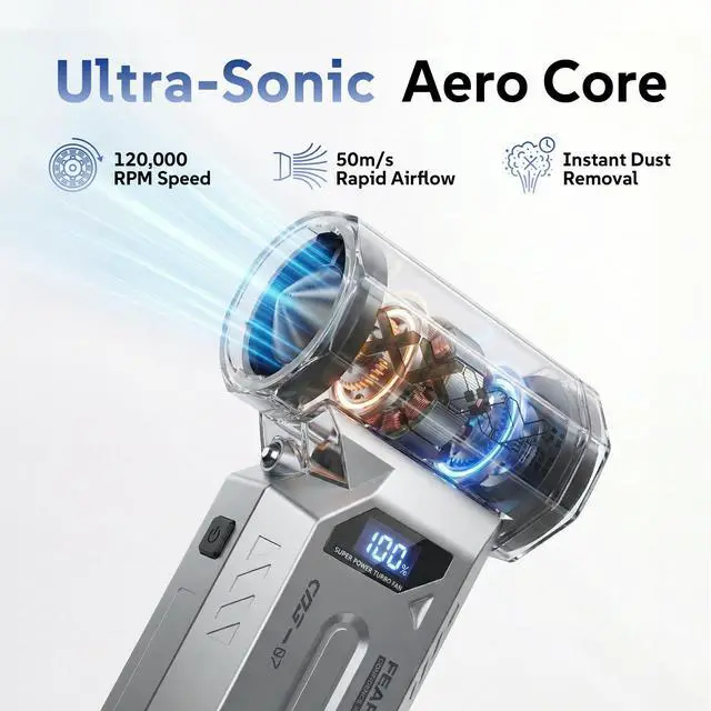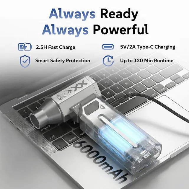 Super Powerful Turbo Motor - 120000 RPMExperience professional, dust-blowing power! Our turbo motor generates a 50m/s wind burst (level 4)strong enough to clean deep keyboard crumbs yet safe for delicate PC components, cameras, and gaming consoles. Say goodbye to expensive, wasteful canned air forever.