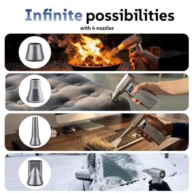 6-in-1 Versatility: More Than a DusterComes with 4 nozzles + 2 brushes to handle any task: a concentrated nozzle for tight spaces, a wide brush for delicate surfaces, and more. Inflate pool toys, blow away leaves, remove pet hair, or clear snow from your car dashboardlimitless uses!