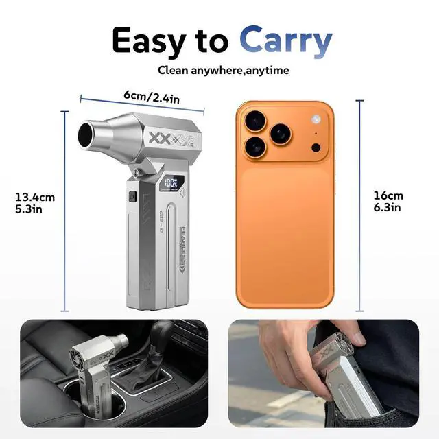 Ultra-Light & Fits Anywhere - 0.5 lbs OnlySmaller than your phone, lighter than a soda can. This ergonomic, pocket-sized blower is your go-to cleaner for your desk car interior, workshop, or even camping gear. No cord hassle, pure cleaning freedom.