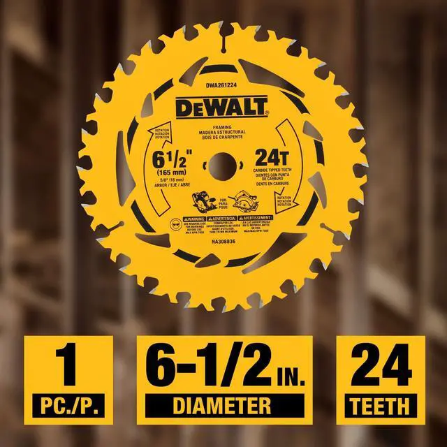 Power through a variety of materials with this redesigned 6-1/2 in. 24T Circular Saw Blade that features cutting-edge engineering for long lasting performance. Redesigned with proprietary heat-vents and a PTFE coating, this blade helps limit binding and dissipates heat for smooth performance in a wide range of applications. From framing to carpentry, this state-of-the art DEWALT® 6-1/2 in. 24T Circular Saw Blade cuts through tough jobs with ease.