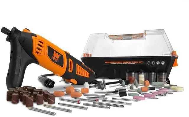 Remember when you had versatility and power all in the palm of your hand? Remove rust from rusty stuff. Trim your dog’s toenails. Engrave beautiful images into your neighbor’s windows while they’re vacationing in Rome. With the WEN Rotary Tool the possibilities are endless, limited only by your imagination and federal law. Equipped with over 190 accessories, this package provides a wide variety of bits and discs to meet the needs of any project. Variable speed can be set anywhere from 8,000 to 35,000 RPM with the simple turn of the speed dial. The handy carrying case makes transportation and storage easier than ever while the lightweight 1.3-pound body limits fatigue during operation. Versatile collet selection allows for bits anywhere from 1/32 of an inch to 1/8 of an inch in size. The removable steady-grip handle provides an alternative method for holding the rotary tool. Its ergonomic design evenly distributes the weight of the tool along the back of your hand, maximizing comfort during long work sessions. Swap the steady-grip handle out for the included flex shaft to help take on intricate and complex designs in glass, plastic, wood, steel and more. And because it is a WEN product, your rotary tool comes backed by a one year warranty, a nationwide network of skilled service technicians, and a friendly and helpful phone line. Carve, cut, grind, deburr, engrave, shape, drill, polish and other verbs all with the WEN Rotary Tool Kit.
