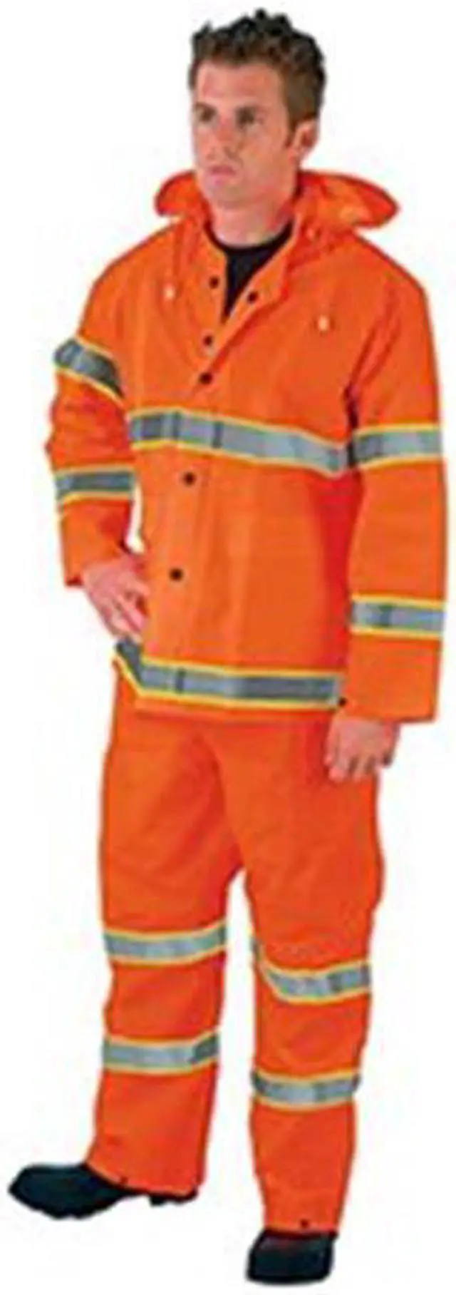 Rainsuit with Detachable Hood, Color Orange, Material PVC, Hood Style Detachable, ANSI Class 1, High-Visibility Yes, Size XL, Jacket Length 32 in, Fly Closure Type Snaps, Style 3 Piece Rain Suit with Jacket/Bib Overall, Includes Lining Yes, Lining Material Polyester, Thickness 0.35 mil, Features Lime/Silver Reflectve Stripes, Includes Hood Yes, Number of Coat Pockets 2, ANSI Type O, Jacket Entry Closure Type Snaps, Inseam 29 1/2 in, Maximum Chest Size 57 in, Maximum Waist Size 50 in