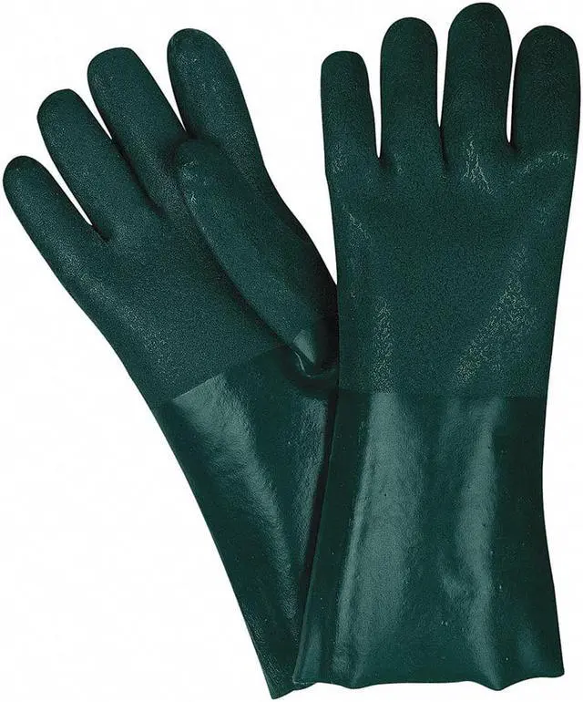 Chemical Resistant Gloves, PVC, Fully, Not Rated, 14 in, Cuff Gauntlet, Lining Jersey, Glove Size L, Color Green, Supported, Standards ANSI/ISEA 105:2016, Resists Abrasion, Chemicals, Oils,