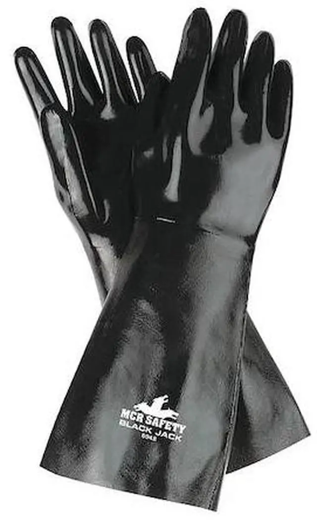 Rugged Black Jack® multidipped neoprene gloves from MCR Safety offer excellent protection against abrasion, scrapes, and hazardous chemicals. A comfortable brushed interlock liner helps keep hands dry, and is Actifresh® treated to resist bacterial buildup, molds, and mildew. Materials meet FDA regulations for food contact. Chemical Resistant Gloves, Neoprene, Smooth, 31.00 mil, 18 In., Cuff Gauntlet, Lining Brushed Interlock, Glove Size L, Color Black, Supported, Resists Abrasion, Chemicals, Oils, 1 Pair