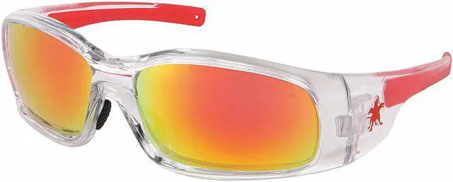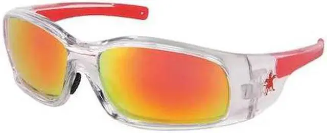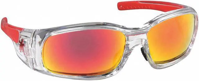 Safety Glasses, Series SR1, Gender Unisex, Lens Color Red Mirror, Polarized Lens No, Lens Coating Scratch-Resistant, No Foam Lined, Eyewear Frame Design Wraparound, Eyewear Frame Style Full-Frame, Frame Color Clear, Eyewear Size M, Frame Material Polycarbonate, Lens Material Polycarbonate, Temple Color Red, Temple Style Bayonet, Photochromatic Lens No, Metal Detectable Yes, X-Ray Detectable Yes, UV Protection 99.99 Percent UVA/UVB, Standards ANSI Z87+