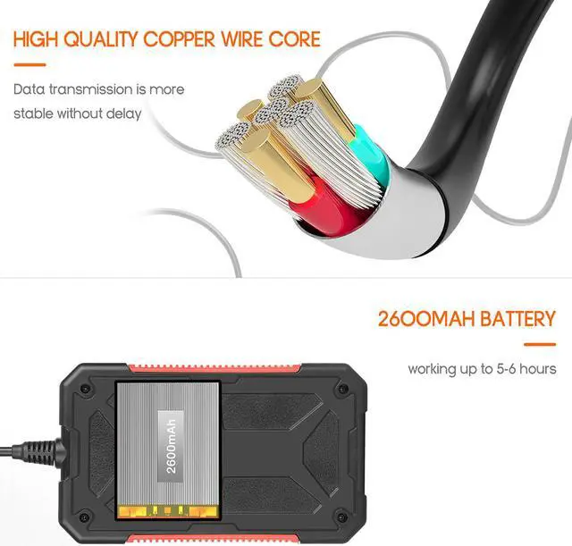4. [ 2600mAh Rechargeable Battery] : endoscope has a built-in battery, which can work 3-4 hours after fully charged. perfect for inspection missing items/pipework/valves/cables/routeways/leaks/corrosion/broken parts/damage/blockages/parts