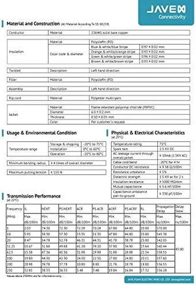 JAVEX UTP CM cables promise the certificated quality defined by UL listed (E516648), ANSI/TIA, and U.S. product safety standard as well as leading testing lab-ETL & 3P VERIFIED TO TIA-568.2-D.