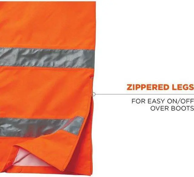 Hi-Visibility Breathable Rain Pants, Material Polyester, Gender Men's, Size 4XL, Color Orange, Inseam 33 3/8 in, Maximum Waist Size 50 in, High-Visibility Yes, ANSI Class E, Number of Outside Pockets 1, Includes Lining Yes, Lining Material Polyester, Ankle Type Boot Zipper, Fabric Weight 13.5 oz, Thickness 0.2 mm, Style Rain Pants, Fly Closure Type Drawstring, Elastic, Waist Closure Elastic, Standards ANSI/ISEA 107 2020, Will Fit Over Boots Yes