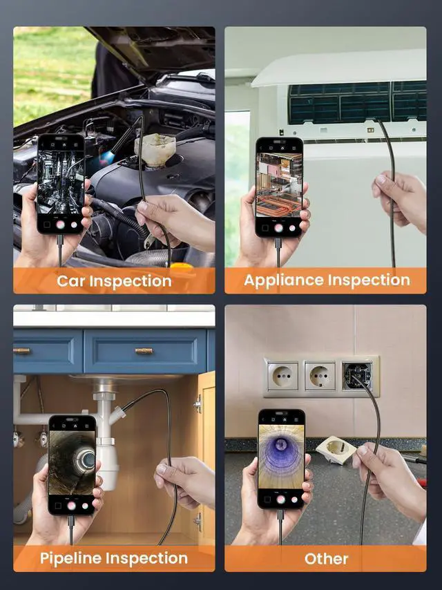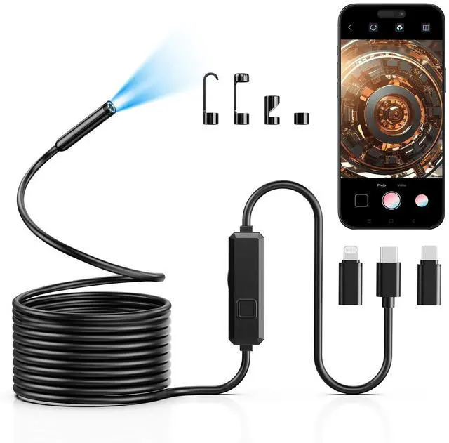 Upgraded HD Camera System: Vorth industrial endoscope camera features a 8mm probe with 2.0MP HD sensor, easily accessing tight spaces like pipelines and engines. 1920×1080 resolution delivers sharp inspection images with excellent close-up capability Wide Compatibility: This borescope works with iOS 9+ and Android 4.2+ systems. Simply download the "UseePlus" app for plug-and-play operation. Featuring industrial-grade noise reduction for interference-free detection and smooth real-time image transmission. IP67 Waterproof: 16.5FT semi-rigid snake cable maintains shape while flexing freely. IP67 rating allows 1-hour continuous operation in 1m deep water, ideal for inspecting drains, AC ducts and other damp environments. Versatile Applications: Equipped with adjustable LED lights and 360° rotatable lens, perfect for automotive repair, pipeline inspection, leak detection, electrical checking and HVAC maintenance - an essential tool for both DIYers and professionals. Package Contents: Endoscope camera×1, Android connector×1, Lightning port×1, Type-C connector×1, 16.5FT semi-rigid cable×1, Accessories: Magnet×1, Hook×1, Mirror×1, Manual×1