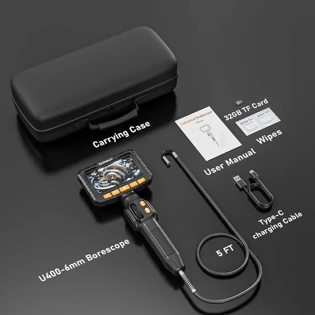 Portable & Easy to Operate: This endoscope camera with light comes with a protective case, 32GB SD card, and Type-C cable for storage and transfer. Its rechargeable battery lasts 4-6 hours. The one-handed joystick handle ensures comfort and precision, ideal for mechanics, DIYers, and home inspectors