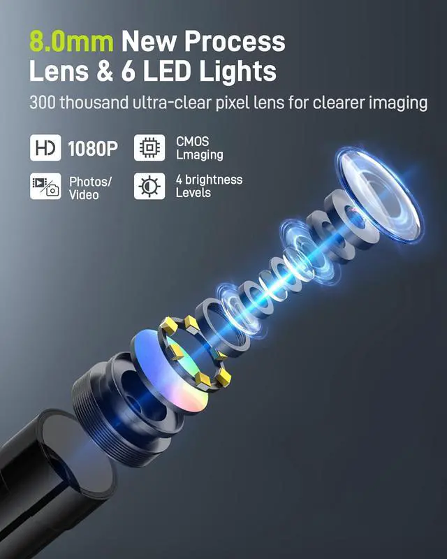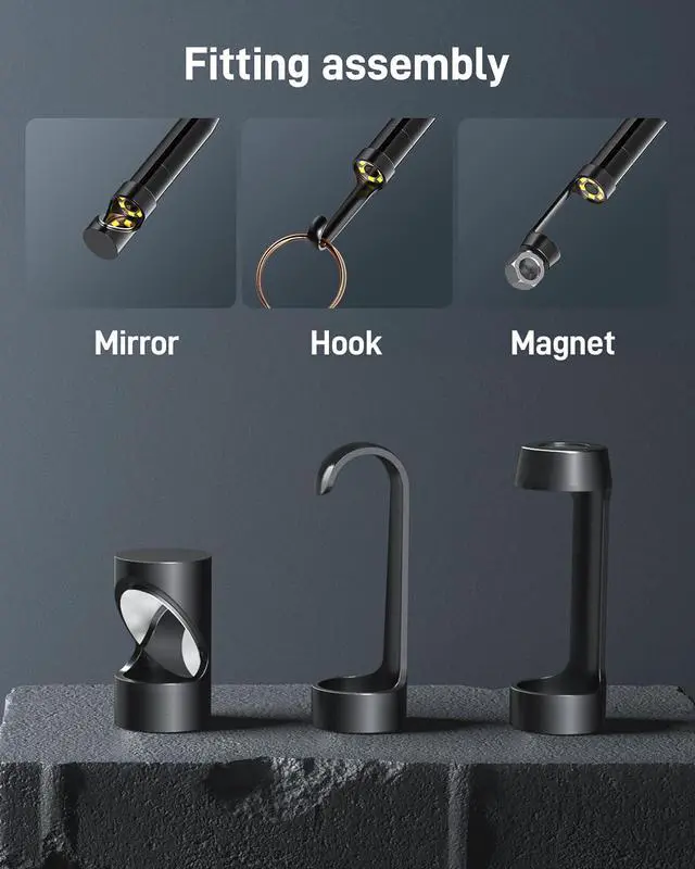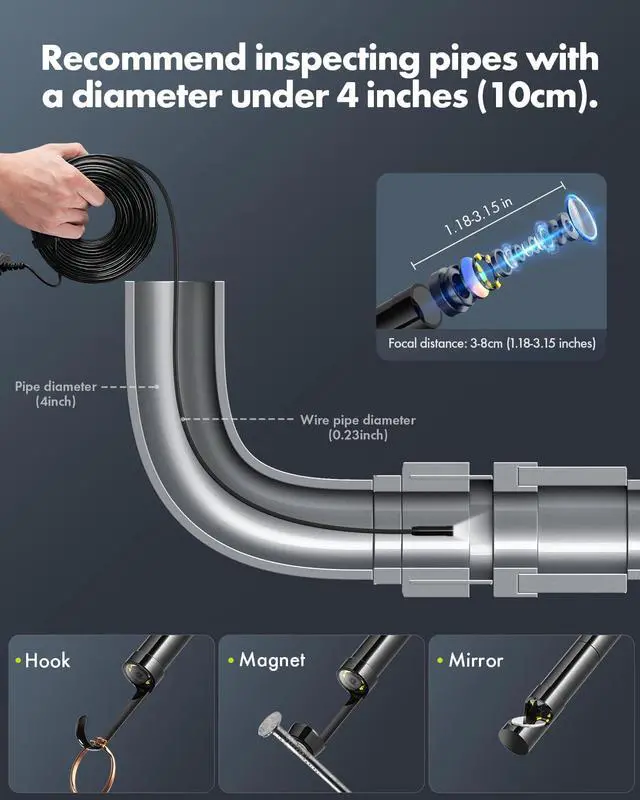 Versatile snake camera - This camera features a 180° rotating function and a 1.2-3.1" focal range. The included hook and magnet help retrieve hard-to-reach objects. IP67 waterproof and 3 adjustable brightness levels ensure clear images even in low light