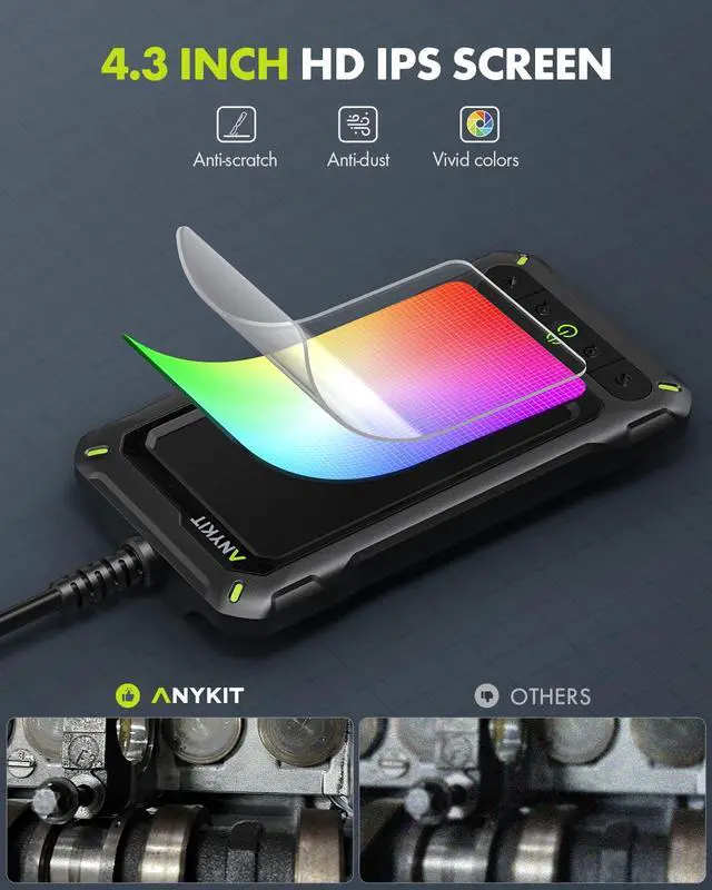 Clear 4.3" IPS screen - Featuring a bright 4.3" IPS screen, this camera provides clear real-time inspections. Its ergonomic design ensures easy handling, helping you diagnose issues quickly