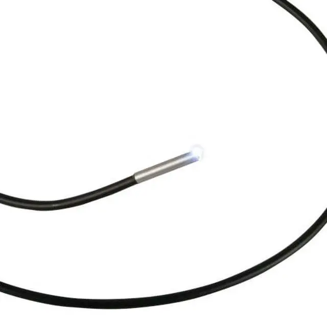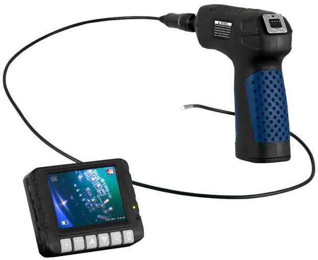 PCE-VE 180 is a rechargeable handheld pistol-grip industrial borescope inspection camera with video recording and image capture functionality. Equipped with built-in LED lighting on the waterproof camera tip, the PCE-VE 180 industrial borescope features a detachable remote control with integrated 3.5" LCD for easy viewing and navigation. The remote control communicates using radio transmission at 2.4 GHz. The industrial borescope is powered by a rechargeable battery that allows for up to 3 hours of continuous use. Recorded images and videos are saved to a MicroSD memory card with a capacity of up to 32 GB. The semi-flexible gooseneck cable of the borescope has a small diameter of just 3.9 mm / .16 in for insertion into tiny cavities. An IP67 ingress protection rating protects the borescope's camera head against dust and water, allowing for use in adverse conditions. The borescope comes with three different attachments: a 90° angle mirror for viewing side walls and around corners, as well as a hook and a magnet for pulling parts out of cavities.