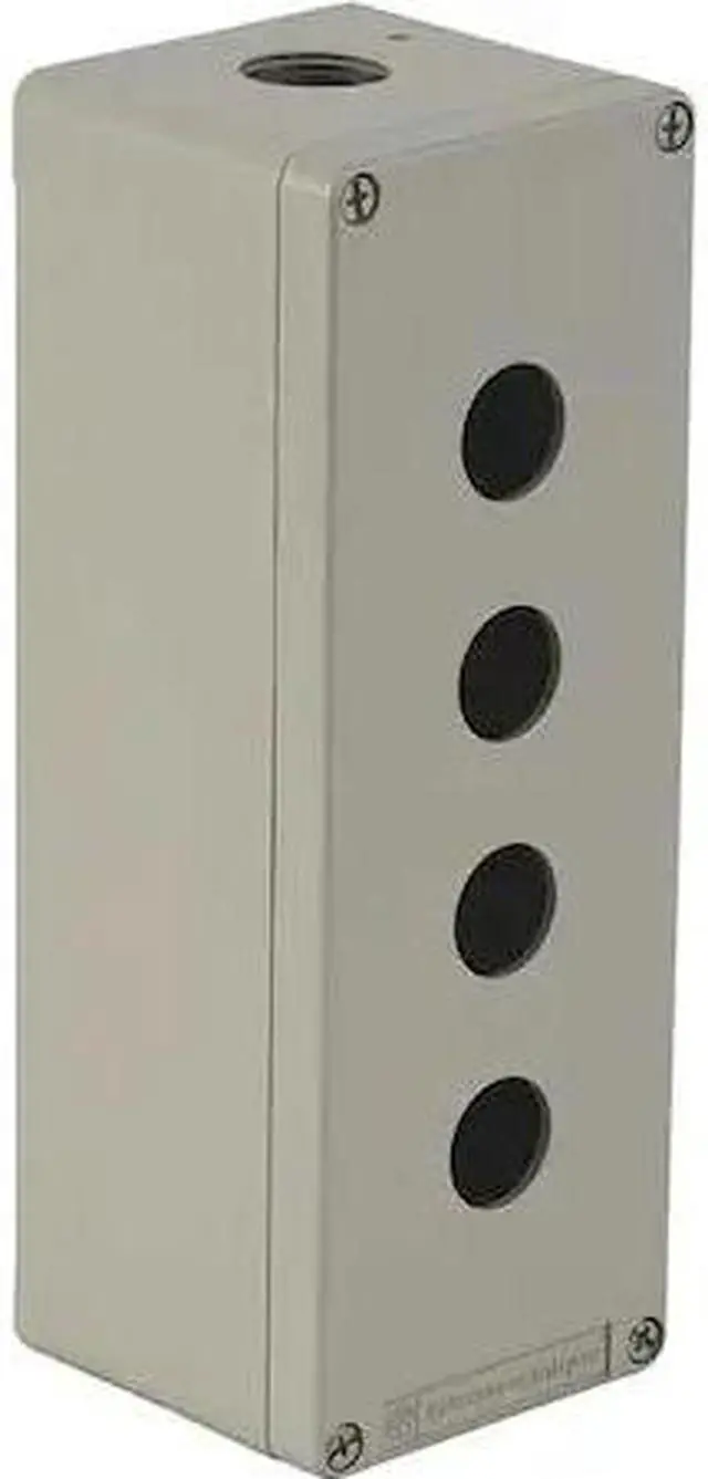 Push Button Enclosure, Number of Columns 1, Number of Holes 4, NEMA Rating 13, 4, Conduit Size 3/4 in, Dimensions 3.03 in H x 3.15 in W x 8.66 in D, Hole Size 22 mm, Material Die Cast Zinc, Height 3.03 in, Width 3.15 in, Depth 8.66 in, Color Gray, Contact Block Depth 2.93 in, Standards RoHS. This item has been restricted from sale in the following state (s): []