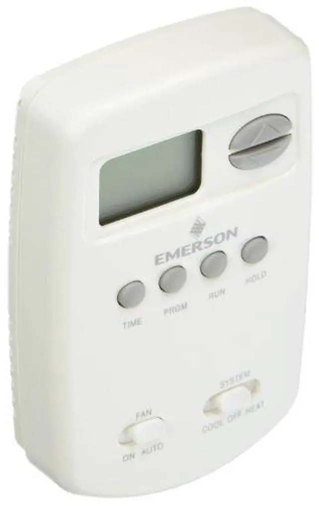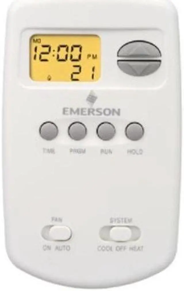Emerson 1E78-151 is a battery-powered thermostat 5/2 day programmable with a large easy display as well as 4 time and 4 temperature settings per program for heating and cooling.