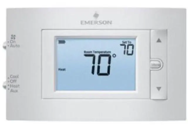 The Emerson 1F83H-21NP is a dual-fuel non-programmable 2-heat and 1-cool stages digital thermostat. It supports terminals R, C, W2, E, Y, O/B, G, L, 24 Volts compatible and Range 45-99 Fahrenheit.