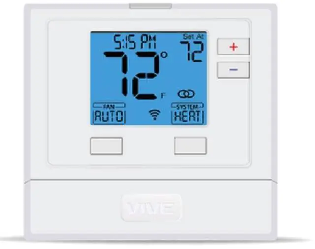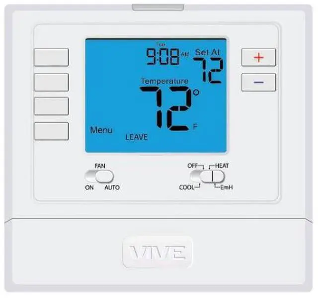 Vive Comfort TP-P-725 is a non-programmable thermostat compatible with conventional and heat pump systems. It features a 4-square-inch backlit display with glow in the glow-in-the-dark light button.