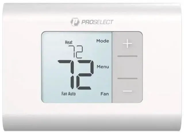 The ProSelect PSTSN 1H/1C is a digital, non-programmable thermostat with a large backlit display, dual power options (battery or hardwired), and compatibility with various heating and cooling systems. It features temperature limits, non-volatile memory, and compressor protection, making it reliable and easy to use.