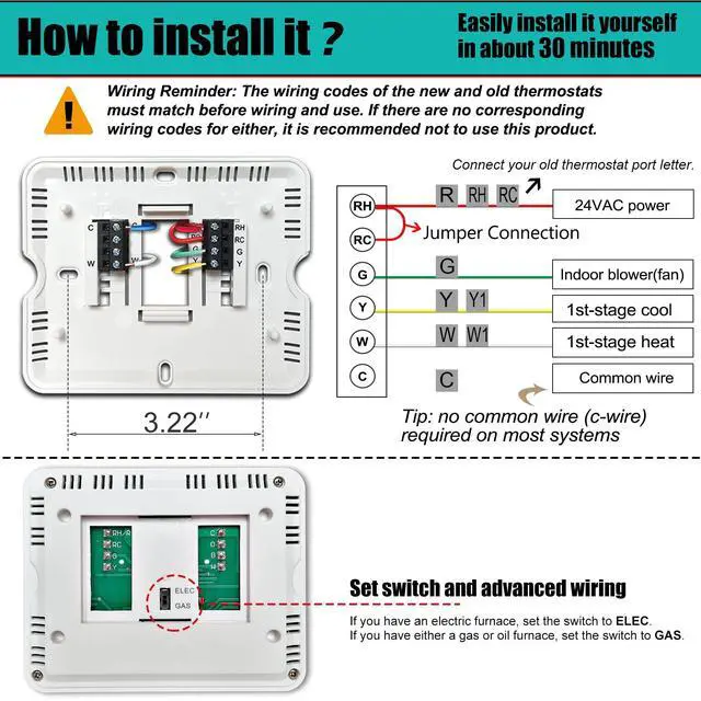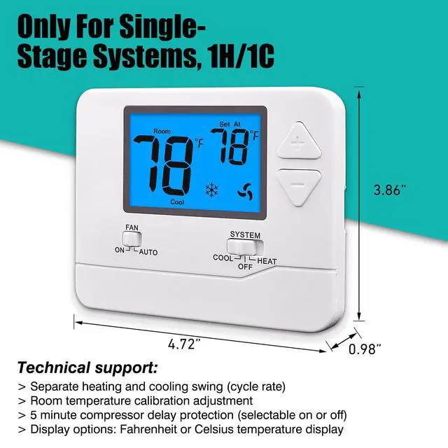 Thermostat Applicationsfor with Conventional Single-Stage Heating (Gas/Oil/Electric Furnace) & Ventilation & Air Conditioning, up to 1 Heat and 1 Cool. ( TIP: Does not work Multistage Heating & Air Conditioning, and HVAC Central Air Conditioner Heat Pump System )