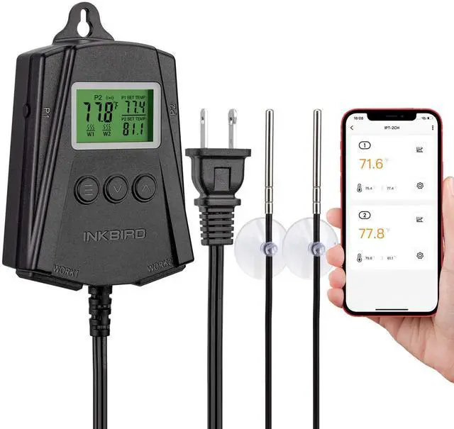 WiFi Heat Mat Reptile Thermostat Controller Temperature Controller with 2 Probes and 2 Outlets, IPT-2CH Reptiles Heat Mat Thermostat (Max 250W per Outlet)