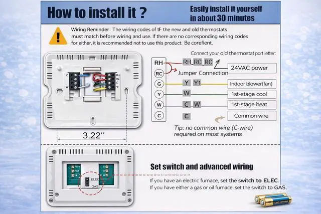 Thermostat Applicationsfor with Conventional Single-Stage Heating (Gas/Oil/Electric Furnace) & Ventilation & Air Conditioning, up to 1 Heat and 1 Cool. ( TIP: Does not work Multistage Heating & Air Conditioning, and HVAC Central Air Conditioner Heat Pump System )