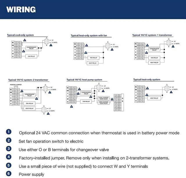 Compatibility: Compatible with Conventional Single-Stage Heating & Cooling Systems (1 Heat/1 Cool), including Gas, Oil, or Electric Furnaces (1 Heat only), Boiler Radiant Heat (1 Heat only), Forced-Air Furnaces (1 Heat only), Cooling Only systems, Gas Fireplaces (24V), and 1H/1C Heat Pump systems without auxiliary heat.