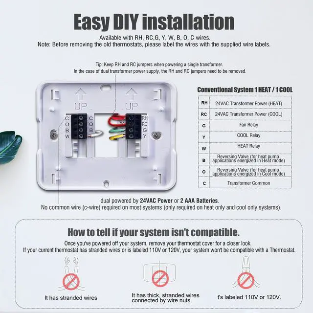 1. Does not work with conventional multistage systems, heat pump systems, mini split systems and 12v rv thermostats. ( 2. Not compatible with 110-240V electric heat systems (like electric baseboard heat, line voltage, convectors, radiant-ceiling heat).