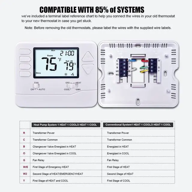 - Terminal Designations: RH, G, Y, C, O, B, E, W2