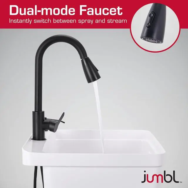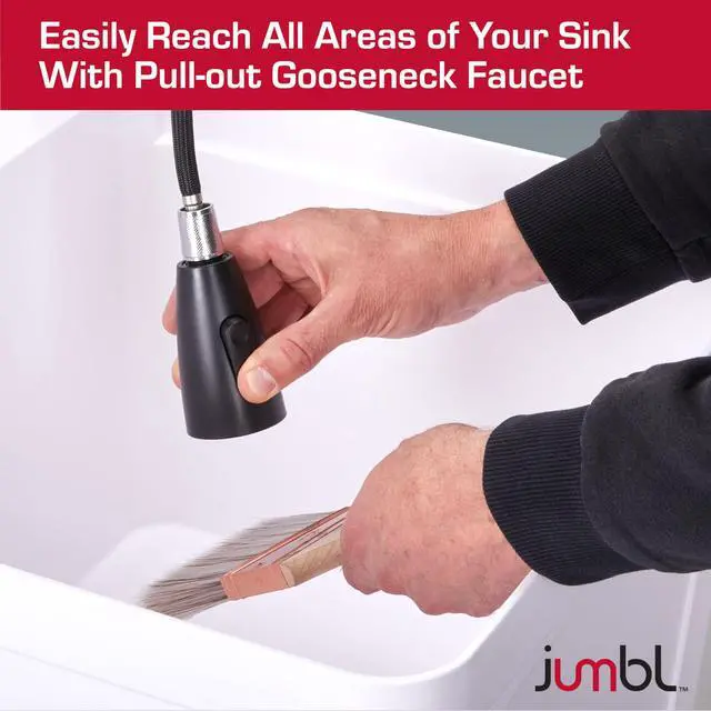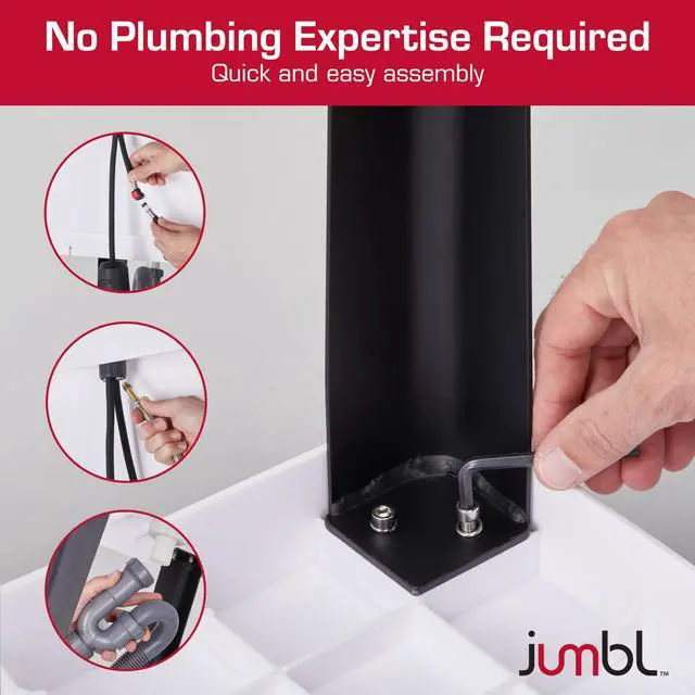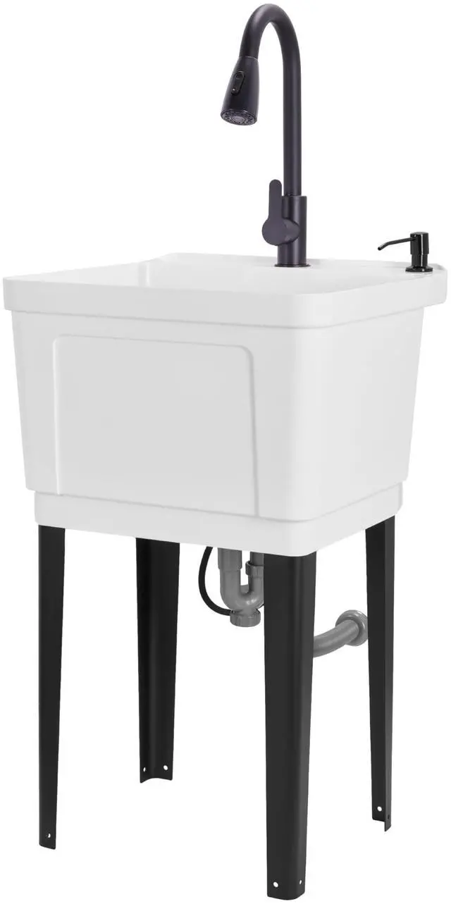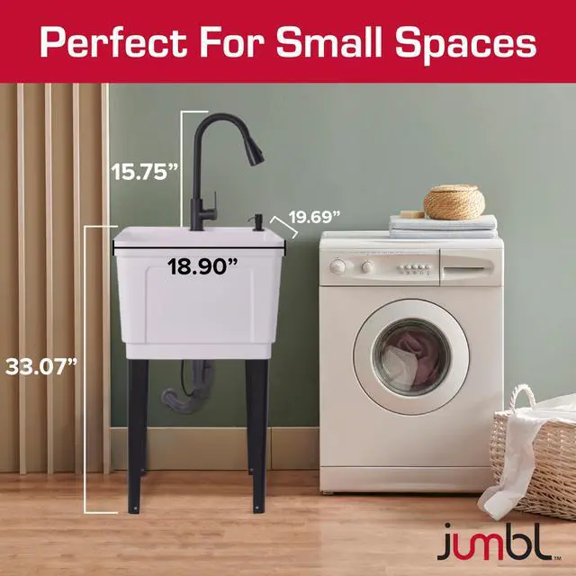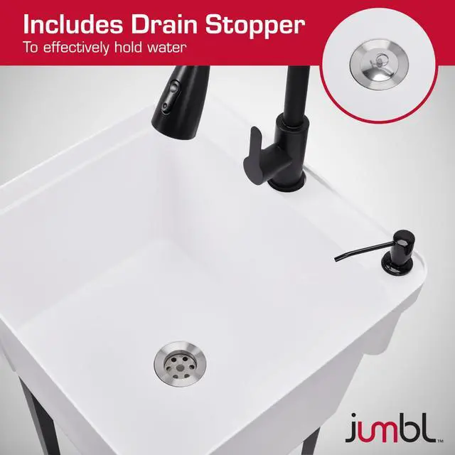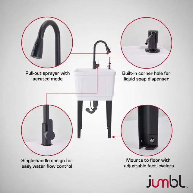 Meet the worlds most beautiful, budget-friendly basin. Bring instant appeal to any laundry room or basement workstation with the Freestanding Utility Sink from Jumbl. Designed for ease of assembly and versatile installation, our all-in-one kit includes an extra deep wash basin, gooseneck faucet with pull-down sprayer, refillable liquid soap dispenser, drain stopper, floor mount levelers, and complete drainage kit for quick hookup to any existing plumbing. The units high-end black styling eliminates the typical utility room eyesore, while our durable materials promise many years of dependable household performance. The sprayers dual-mode design lets you switch from spray to stream in a flash, while the watertight plug holds gallons of water for your cleaning convenience. And rest assuredthe installation process will not drain you. Our laundry sink arrives with simple step-by-step instructions and all the plumbing accessories and hardware needed to assemble yourself (just a few tools required). Whether youre soaking muddy clothes, rinsing odds and ends, mopping floors, or washing small pets, we guarantee a splashing good time. Add a Jumbl Utility Sink to your cart today! What You Get 1 x Sink 1 x Faucet 4 x Iron Legs 4 x Mounting Brackets 1 x Drain Plug 1 x Soap Bottle with Pump 1 x Inlet Pipe 1 x U-Shaped Drain Pipe 1 x Allen Wrench Hardware Pack Assembly Guide Specs & Details Dimensions: 33 x 18.89 x 19.68 Weight: 19.8 lbs. Color: black Capacity: 21 gallons Faucet: pull-down, single-handle How to Enjoy Follow the simple instructions to assemble and mount your sink Take control with the dual-mode sprayer with pull-down extension Keep soap, detergent, or liquid cleaner stocked in the dispenser Admire its extreme durability, versatility, and elegance!