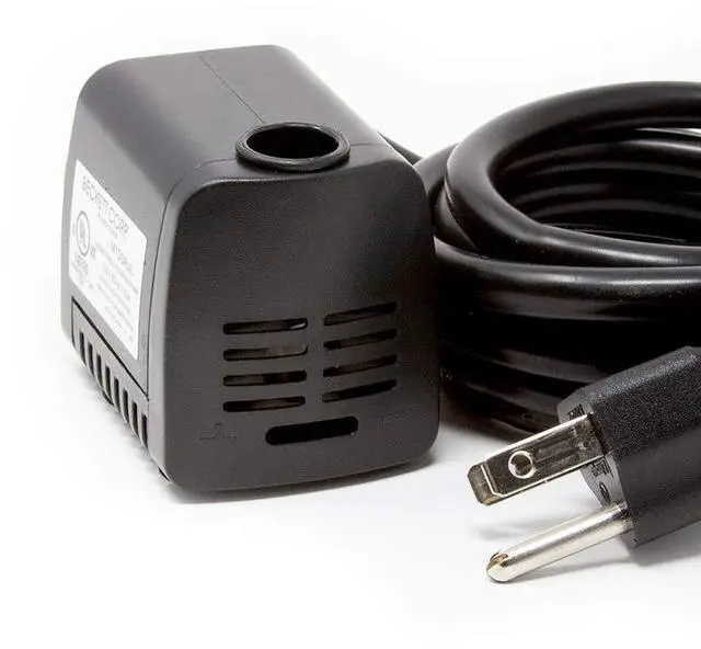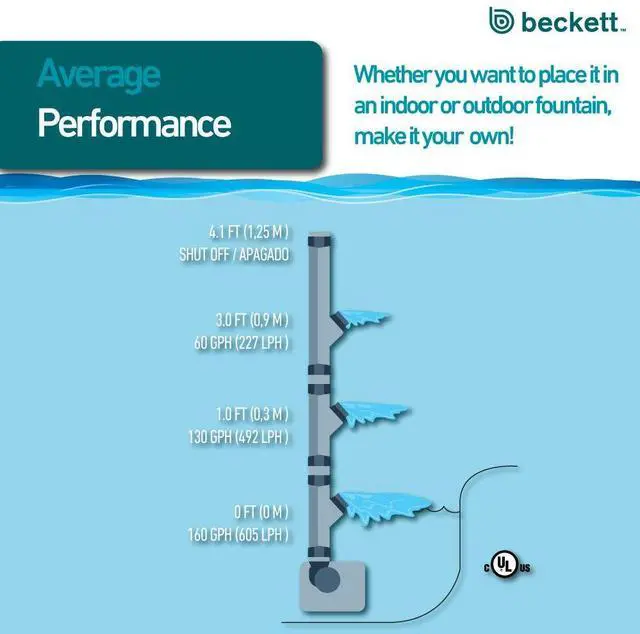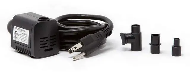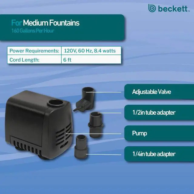 The Beckett 160 GPH 8.4 Watt Submersible Fountain Pump is designed for most indoor and outdoor fountains as well as for fish tanks, hydroponics, aquaponics, ponds, statuary, and aquariums. At 8.4 watts, this energy-saving pump has a maximum flow of 160 gallons per hour, with a maximum pumping height of 4.1 ft. This pump is ideal for 1 ft. to 3 ft. fountains and includes adjustable flow control. Featuring wet rotor technology, this pump is designed for continuous use. It efficiently pumps 130 GPH at a height of 1 ft and conveniently connects to 1/4 in. or 1/2 in., ID tubing. This pump is equipped with a 6 ft. cord. Low maintenance, clean your pump for optimal performance. Unplug the pump before handling and remove the intake screen and impeller by disconnecting them from the pump. Remove any residue using a stream of water, small brush or cloth, then rinse clean. Easy to operate, submerge the pump entirely underwater, and plug the cord into the nearest GFCI outlet. Always disconnect the cord from the electrical outlet before handling and repositioning your pump. To preserve the life of your pump, it should be completely submerged under water at all times when in use, and not run dry.
