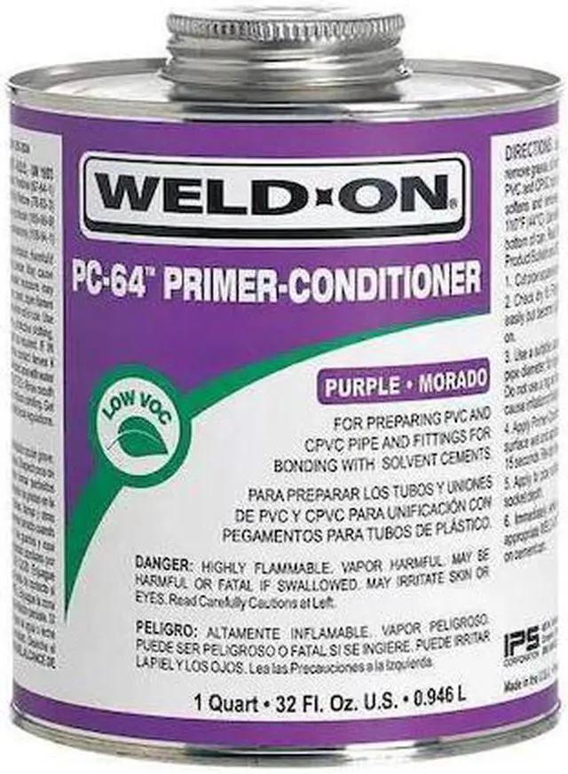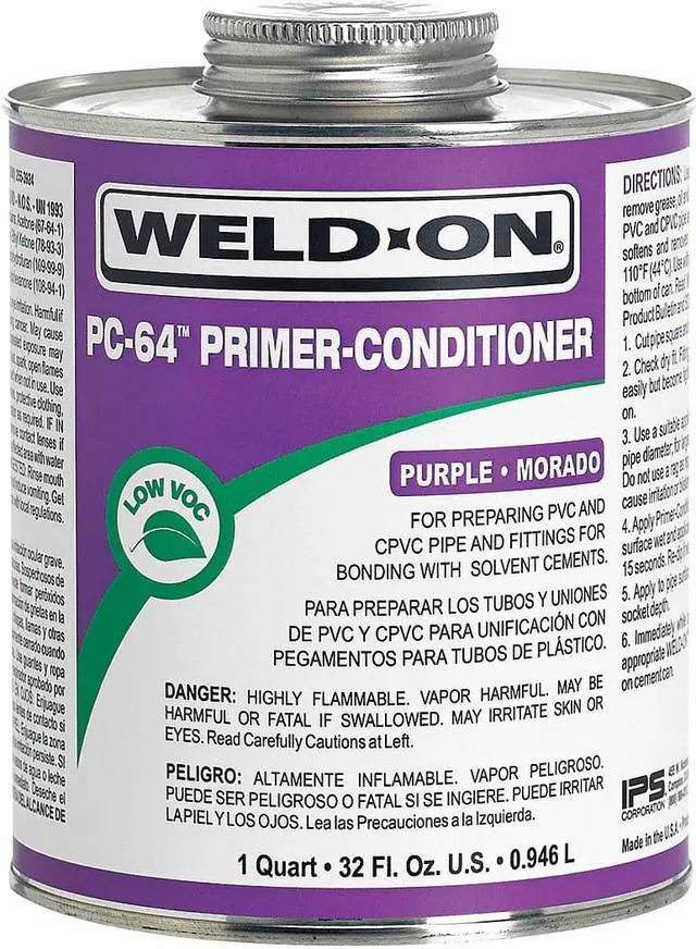 Primer Conditioner, Container Size 32 oz, Container Type Can, Cured Color Purple, For Use on Adhesive Type Pipe, Product Type Primer, Series PC-64, Standards SCAQMD Rule 1168/316A, Maximum Performance Temperature -10 Degrees F, Minimum Performance Temperature 110 Degrees F. This item has been restricted from sale in the following state (s): []
