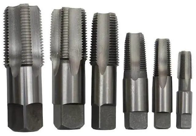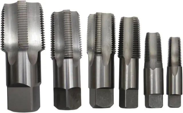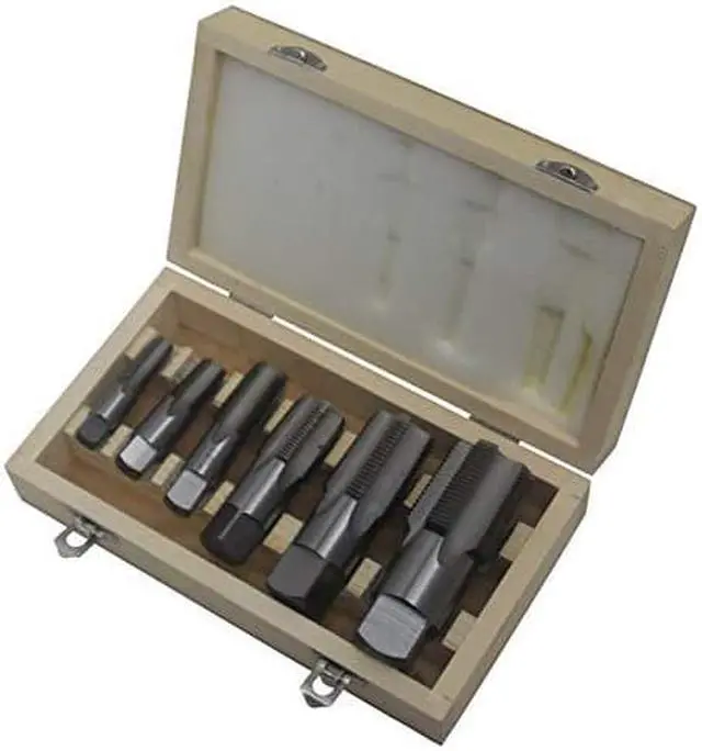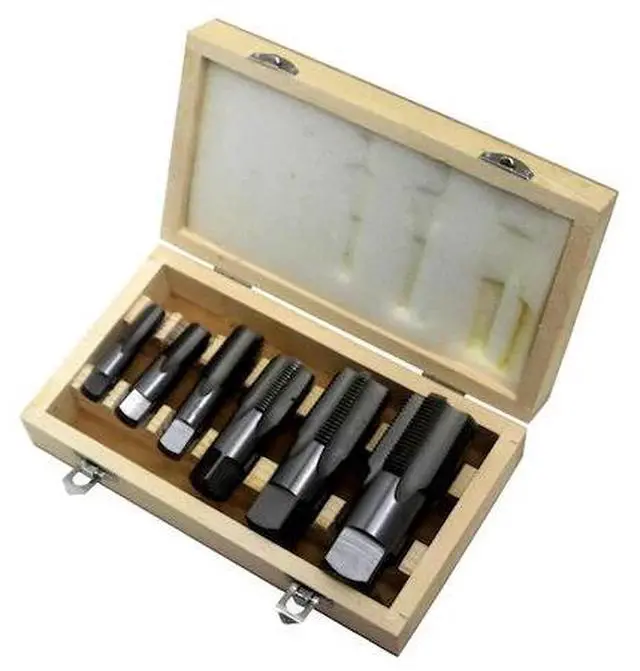 California Proposition 65: This product contains a chemical known to the State of California to cause birth defects or other reproductive harm. National Pipe Taper Taps (NPT) are appropriate for threading a wide variety of materials both ferrous and non-ferrous. The nominal size of a Pipe Tap is that of the pipe fitting to be tapped, not the actual size of the tap. The thread tapers 3/4 of an inch per foot. All Pipe Taps furnished with a 2-1/2 to 3-1/2 thread chamger. NPT threads require the use of a "sealer" like teflon tape or pipe compound. 6 Piece High Speed Steel NPT Pipe Tap Set 1/4", 3/8", 1/2", 3/4", 1" and 1-1/4" in Wooden Case. National Pipe Taper Taps (NPT) are appropriate for threading a wide variety of materials both ferrous and non-ferrous. The nominal size of a Pipe Tap is that of the pipe fitting to be tapped, not the actual size of the tap. The thread tapers 3/4 of an inch per foot. All Pipe Taps furnished with a 2-1/2 to 3-1/2 thread chamger. NPT threads require the use of a "sealer" like teflon tape or pipe compound.